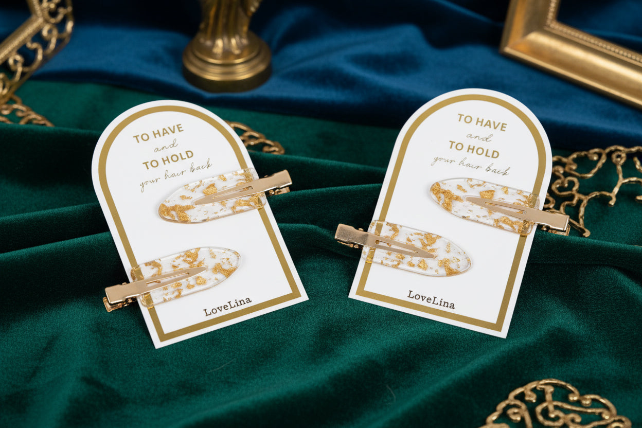 Elevate your bridal party's look with these stunning gold glitter hair clips, crafted from premium acrylic resin for a luxurious finish. Each clip features eye-catching sparkle that complements any wedding aesthetic, from intimate ceremonies to grand celebrations. This eight-piece set offers versatility for bridesmaids or guests seeking coordinated elegance. The durable resin construction ensures these clips withstand the demands of a full day of festivities whilst maintaining their radiant appearance. Perfect as bridesmaid gifts or bachelorette party favours, they add a touch of glamour to any hairstyle with effortless sophistication.